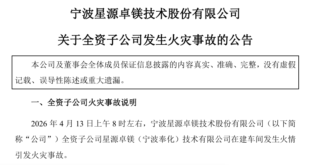 4月14日晚间,星源卓镁(301398)发布公告称,4月13日上午8时左右,公司全资子公司星源卓镁(宁波奉化)技术有限公司在建车间发生火情引发火灾事故。