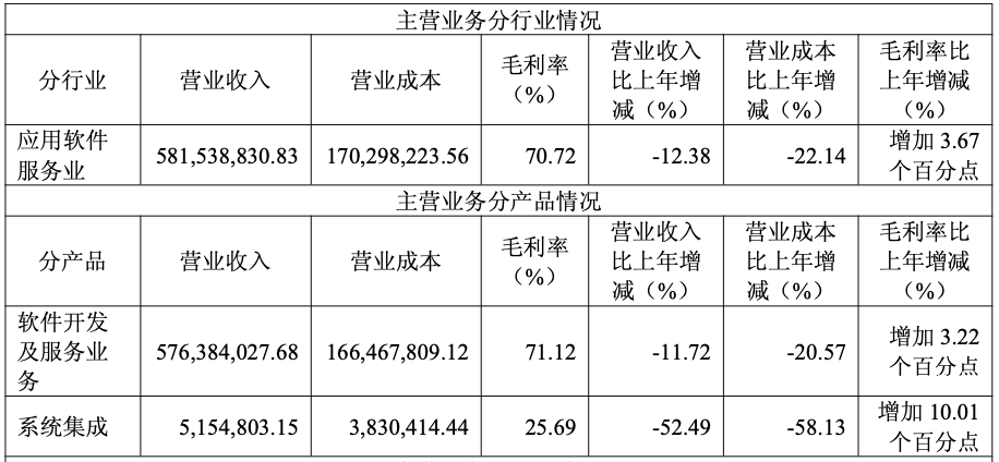 分行业来看,应用软件服务业务2025年实现营业收入581,538,830.83元,同比减少12.38%。分产品来看,软件开发及服务业务2025年实现营业收入576,384,027.68元,同比减少11.72%,系统集成业务实现营业收入5,154,803.15元,同比减少52.49%。