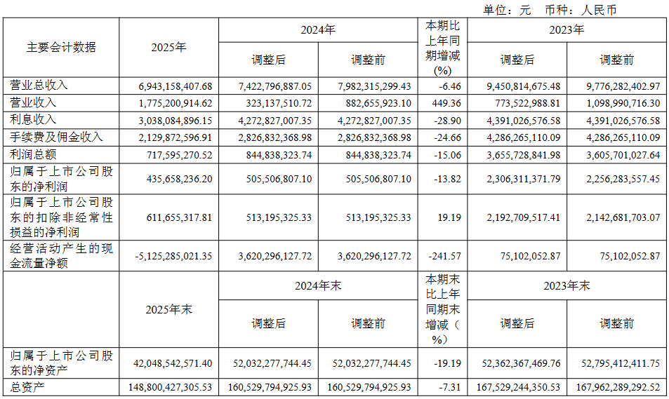 2025年末,公司经营现金流净额为-51.25亿元,同比下降241.6%。主要系公司下属子公司购买的为交易目的而持有的金融资产相关现金流量支出较上年同期有所增加。