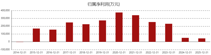 拉长时间线来看,公司营收、归母净利润已连续5年下滑。其中,营收从2020年的163.4亿元一路下滑到2025年的69.43亿元,近利润从37.52亿元下滑到4.63亿元,跌幅达88.38%。
