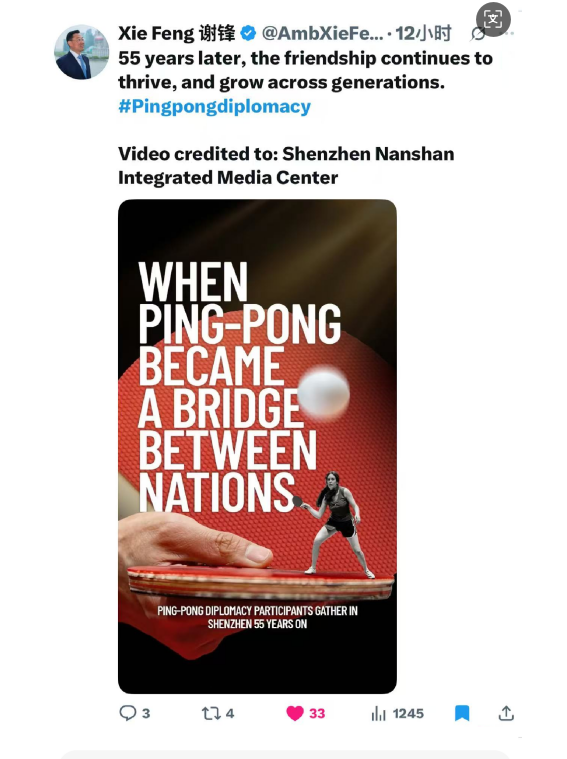 当时,谢锋大使在转发时写道:“国与国之间的关系,归根到底是人与人之间的关系。匹克球交流的故事,正是中美之间无数温暖连接的一个缩影,也为我们的未来带来了无尽的希望。”