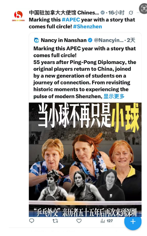 近日,一条来自深圳南山的视频,再次在外交部官方账号“刷屏”。中国外交部发言人、中国驻加拿大大使馆、中国驻美国大使谢锋、中国外文局文化传播中心等账号,在海外社交平台纷纷转发这段跨越55年的“回声”。