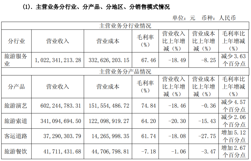 读创财经注意到,分产品来看(见下表),公司4大业务板块旅游演艺、旅游索道、客运道路、旅游项目的营收全部下滑。其中,旅游演艺、旅游索道、客运道路下滑幅度分别为18.46%、20.30%、18.08%,均为双位数下滑,导致公司整体利润空间明显收窄。