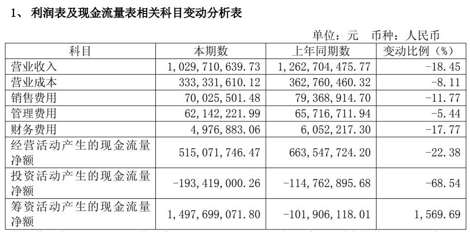 年报显示(见下表),公司报告期营业收入同比减少18.45%,主要系公司游客接待减少,导致收入减少所致;经营活动产生的现金流量净额为5.15亿元,同比减少22.38%,主要系旅游游客减少,导致收入减少所致。