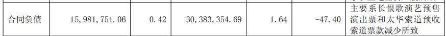 年报还显示,公司合同负债同比大降47.40%,主要系长恨歌演艺预售演出票和太华索道预收索道票款减少所致。