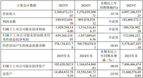 截至2025年12月31日,公司总资产为1,448,483.38万元,归属于上市公司股东的净资产为10,562.06万元,同比减少90.93%。归属于上市公司股东的净资产、加权平均净资产收益率、扣除非经常性损益后的加权平均净资产收益率发生变动主要系本期较上期亏损幅度收窄,且本期完成房地产相关资产处置,上述因素共同导致相关指标发生相应变动。