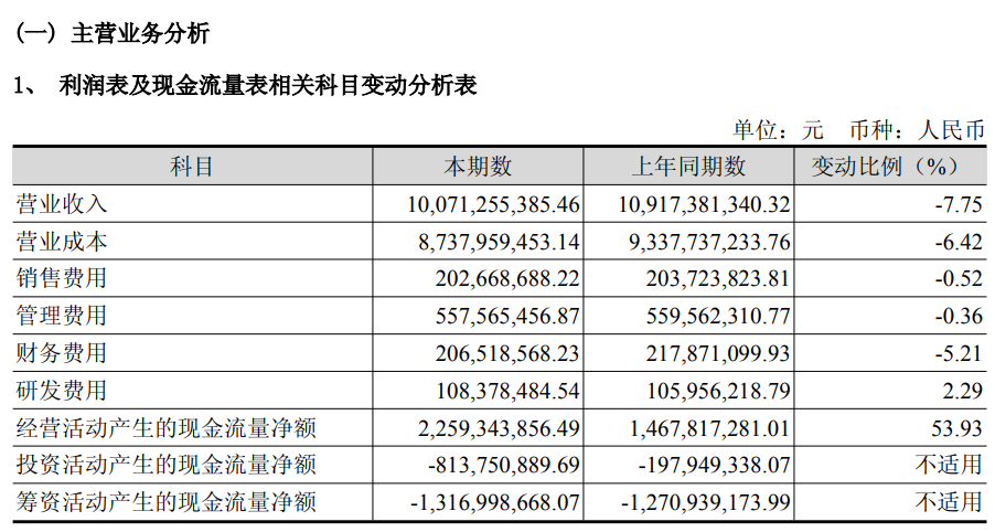 销售费用较上年减少105.51万元,下降0.52%,主要为部分运营费用降低所致;管理费用较上年减少199.69万元,下降0.36%,主要为部分运营费用降低所致;财务费用较上年减少1,135.25万元,下降5.21%,主要为租赁负债未确认融资费用摊销序时减少所致;研发费用较上年增加242.23万元,上升2.29%,主要为加大研发投入力度,研发项目增加所致。