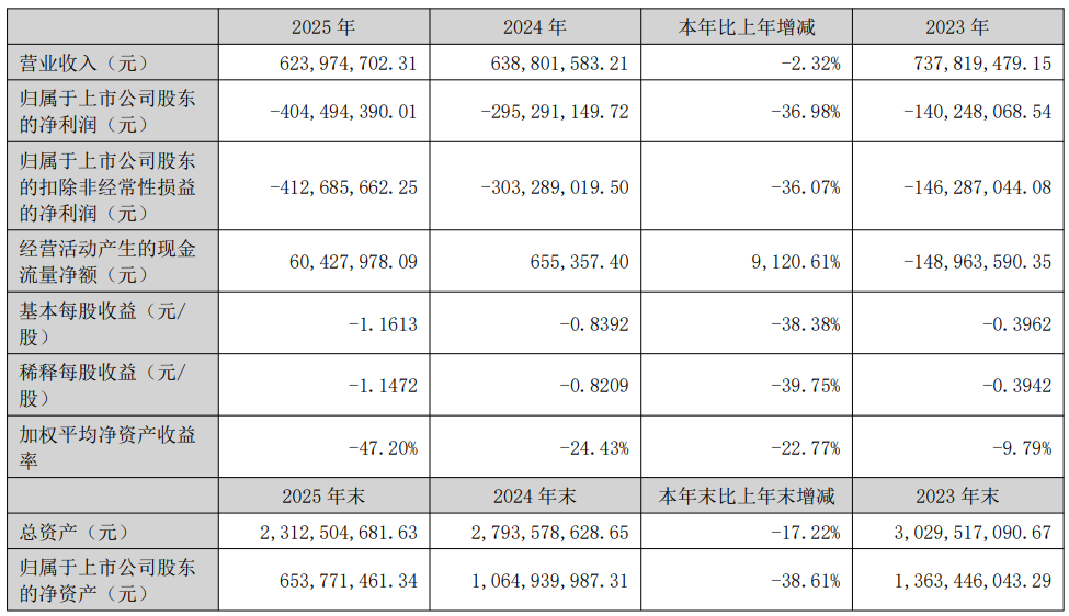 广济药业2025年年报显示,公司报告期营业收入为6.24亿元,同比下降2.32%;归母净利润自上年同期亏损2.95亿元变为亏损4.04亿元,亏损额进一步扩大;扣非归母净利润自去年同期亏损3.03亿元变为亏损4.13亿元,亏损额进一步扩大。