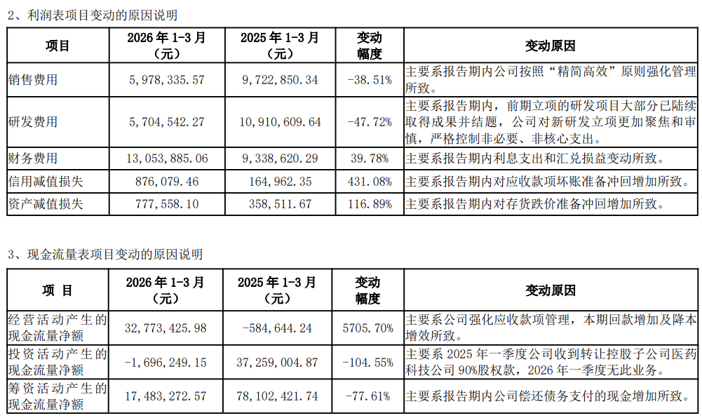 一季报显示,公司首季财务费用增加39.78%,主要系报告期内利息支出和汇兑损益变动所致,但同期销售费用减少38.51%,研发费用减少47.72%。