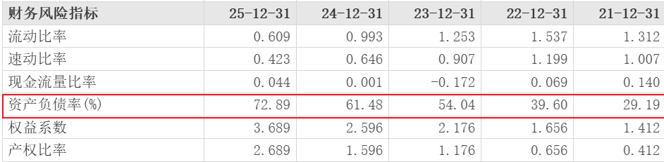 另外,值得注意的是,东方财富网财务风险指标显示,广济药业2025年资产负债率为72.89%,已经是连续4年持续攀升。