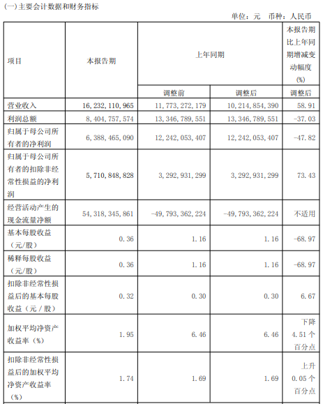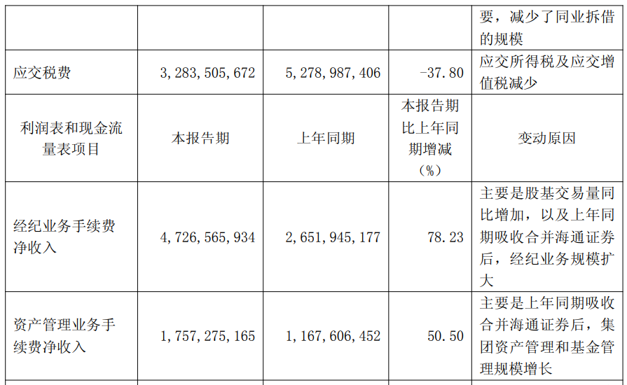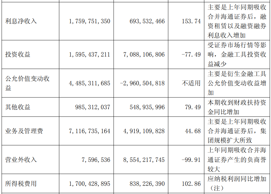 对于报告期内公司实现归属于母公司所有者的净利润近乎“腰斩”的情况,公司在一季报中解释说,主要是上年同期吸收合并海通证券产生负商誉,使得上年同期营业外收入较高。